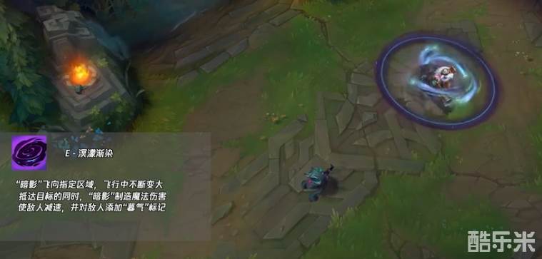 抵达目标的同时,“暗影”制造魔法伤害,使敌人减速,并对敌人添加“暮气”标记。