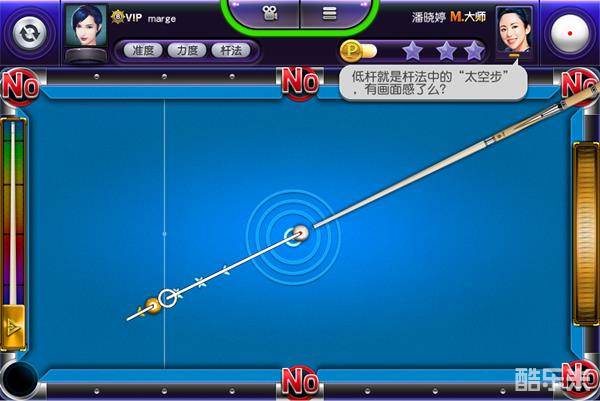 出杆之前,要预判母球行进线路和理想位置。体会杆头的延伸长短与发力大小之间的配合,记住每一次自己发多大的力,白球走到什么样的位置。