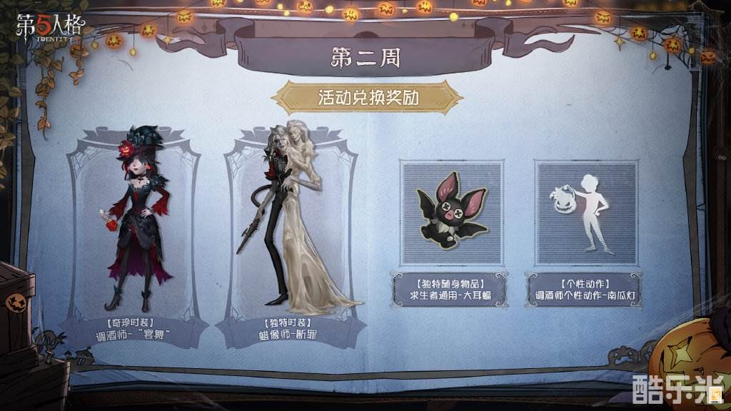 ※10月27日维护后,侦探们完成指定任务即可获取活动代币,兑换【奇珍时装】调酒师-“宴舞”、【独特时装】蜡像师-断罪、【独特随身物品】求生者通用-大耳蝠和【个性动作】调酒师-南瓜灯等丰厚奖励~