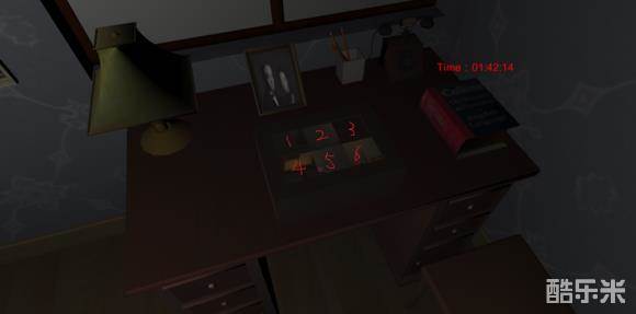 使用在钢琴上取出的钥匙打开厕所边上的书房门,首先来到桌子前面,有一个拼图盒子,如图5-1, 最快的打开方式是:6-5-4-1-2-3-6,将光标至于对应位置,点击触控板即可。打开盒子后取出里面的蜡烛,仿照那副画的样子将蜡烛至于烛台上,用厨房拿到的打火机打着,然后会出现一串英文“the old man and sea”(老人与海),回头,在身后的书架上,凝视那一本特殊的书,取出里面的主卧钥匙,书房就结束了。