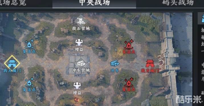 在一个主战场上,分为三条路线,每条路线的中央都会有一个中立的资源点。若玩家击破最中央的中路,则可以获得进攻对面城门的冲车,击破两边这种分支援点的话,则可以获得对城门造成伤害的投石车以及对人员造成伤害的驽车和拋车,这两种小的载具,也有不俗的效果。