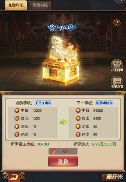 龙脉印玺玩法也就是上面君主技所说的玉玺玩法,玉玺一共有12个品阶,通过凤鸾玉璧等养成道具可以进阶到更高品阶的玉玺。每个品阶的玉玺在激活后,都可以提高所有武将属性,养成道具可以在商城兑换或者购买直购礼包获得。