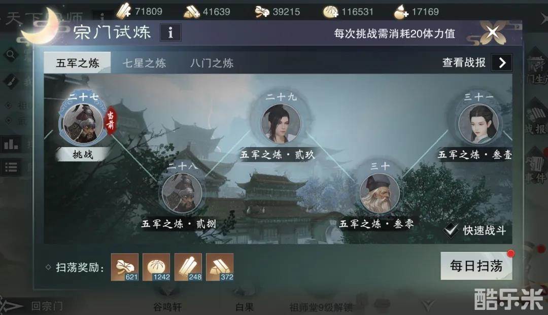 五军之炼、七星之炼、八门之炼关卡阵容有所不同,五军之炼适合力属性门人进行挑战,七星之炼中慧属性门人则有更大的优势,而八门之炼中选择御属性的门人则有事半功倍的效果。