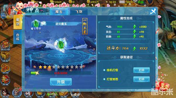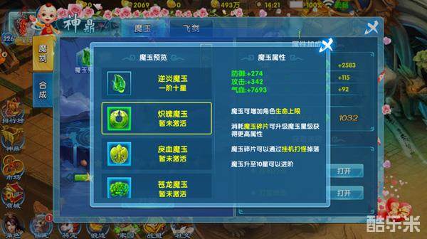 神鼎可帮助玩家提升战力,是玩家通往称王称霸路上不可缺少的影响因素之一。神鼎分为魂器和合成两部分,其中魂器有魔玉和飞剑,合成则能把材料进阶。