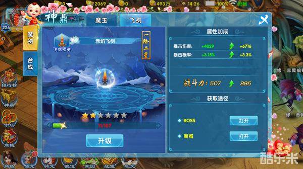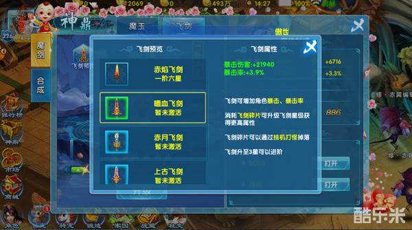 魂器 — 飞剑:飞剑可增加角色的暴击和暴击率,消耗飞剑碎片可升级飞剑星级获得更高属性和提升战力