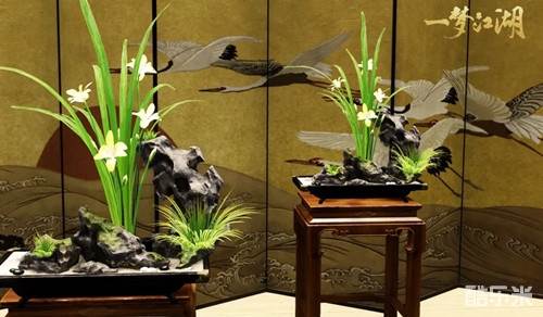将刚刚抽枝的新芽比作高大的乔木,点缀鲜嫩可爱的小黄花,再配上乱石假山,看似随意地摆放,却能将芳草柔美舒展的姿态和湖石巧妙融合,清新怡然!