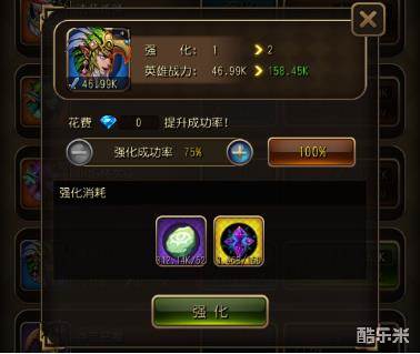 在通关13战役后,将会开放游戏中最给力、最牛B的提升战斗力功能,那就是英雄强化。看到图1那个特别的蓝色按钮没,在看看图2强化前后的战斗力,哇咔咔46.99K提升到158.45K,简直逆天哟。