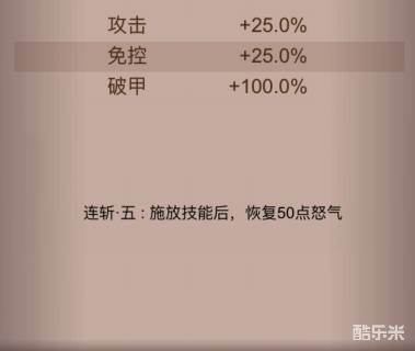 技能属性:满级利刃,限定技能(连斩),释放技能后,恢复自身50点怒气。随着等级不断提高,恢复的怒气值增多。一星20点怒气、二星25点怒气、三星30点怒气、四星40点怒气、五星50点怒气。