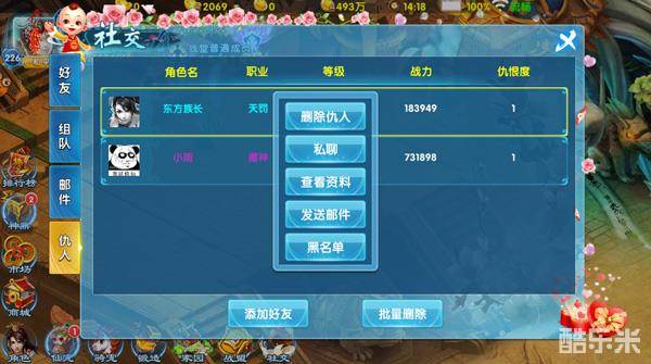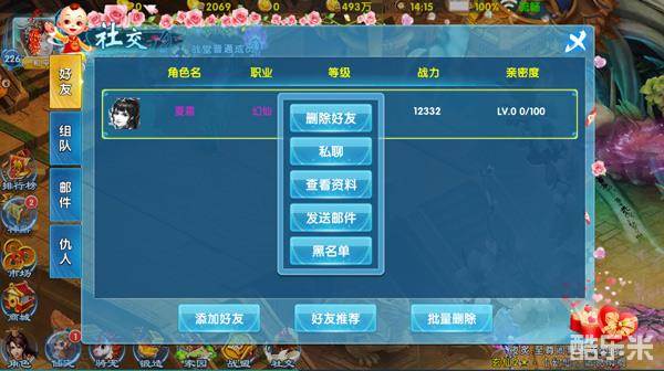 玩家可通过好友界面添加好友和删除好友,点击好友可以管理好友,可以和好友私聊交易,发送组队邀请、赠送鲜花等。