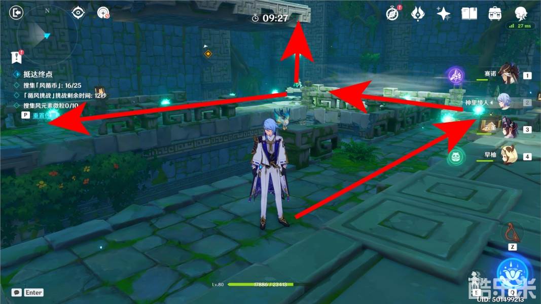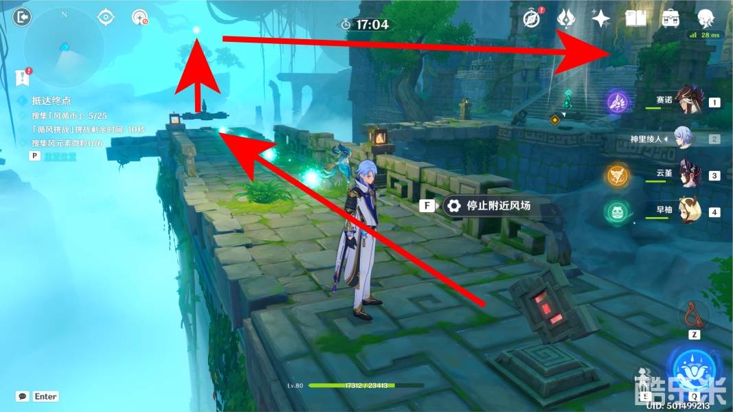 在绫人所站位置可以看到第二个挑战点,开启挑战,启动「止风枢」,收集完微粒后通过调整「拦风枢」的朝向往上飞。