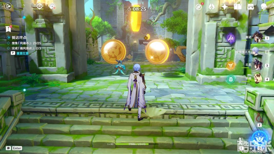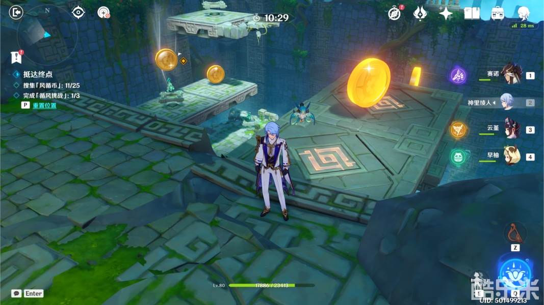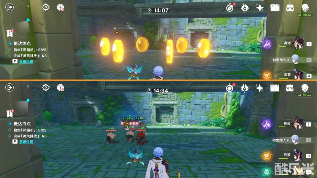 击败此处的丘丘人会出现六枚风寻币,如果不捡的话,最后无法完成第二个奖励条件。
