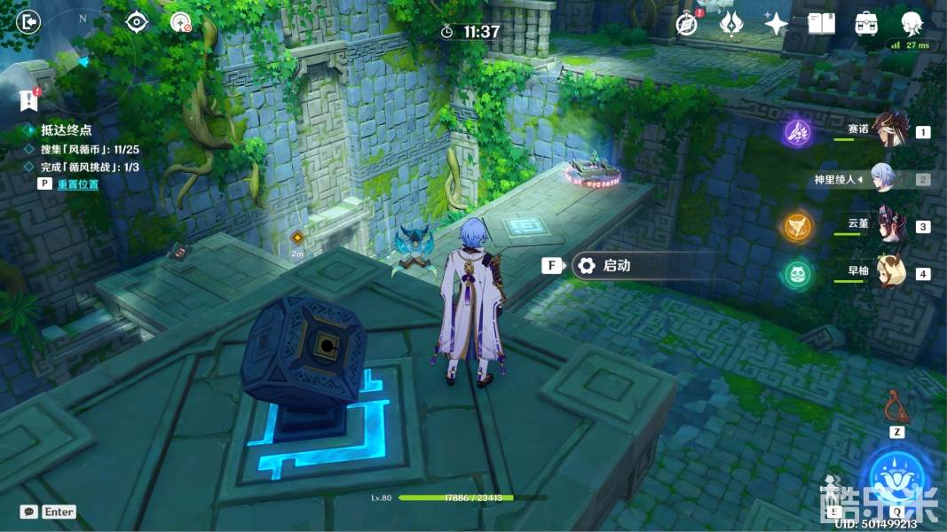 此时我们还差一个币能完成收集风寻币的任务。我们回到「止风枢」的位置,启动它,沿路调整「拦风枢」朝向,拾取最后的六枚风寻币。