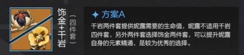 干岩两件套提供妮露需要的生命值,妮露不适用干岩四件套,另外两件套选择饰金两件套,可以提升妮露自身的元素精通,是较为优秀的选择。