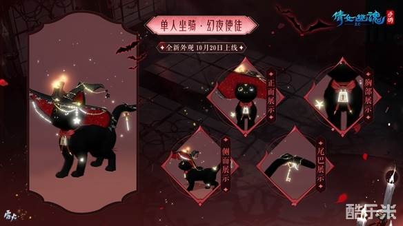 十月奇幻主题时装【绯夜华章】首曝!神秘黑红配色,优雅绮丽,将于10月20日华丽上线。乖巧月夜坐骑【幻夜使徒】奇妙来袭!谁能拒绝一只活泼可爱的异瞳黑猫坐骑呢?更有全新伞韵外观【暗月灵眸】同步推出,复古蕾丝,星光镶嵌。快穿上新装共赴这场奇幻夜舞会吧。