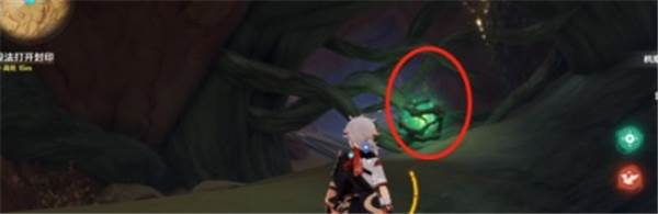 3、来到洞穴之后,在这里会遇到路障,如下图所示的位置有一个绿色的晶体,攻击它开启路障继续前进;