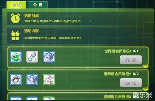 世界盾组织将会给会员们发放专属福利,每天固定时间段刷新次数,小伙伴们记得来领取哟,有丰厚的训练挑战券以及考场挑战券获取。