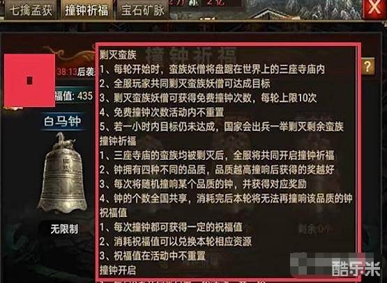 1、玩家进入活动页面点击撞钟祈福活动,点击右上角的问号就能看到活动的玩法。主要分为剿灭蛮族、撞钟祈福、祝福值三个部分。