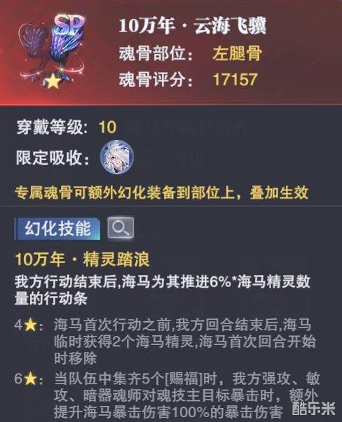 首先是230抽的左腿专属魂骨,这款魂骨的价值主要是体现在PVP战斗中,其中基础的推进行动条效果就可以为我们提供非常可观的行动频率提升,当大家的海梦精灵集齐6只以后(战斗中围绕在海马建模旁的海梦精灵数量最多是4只,但其实这个技能最高可以召唤6只海梦精灵,大家不要被战斗特效也骗了),36%行动条推动效果基本上就是我方魂师行动结束,其便会出现在右侧行动条的差不多中间位置,这从视觉上就已经够能带来冲击的了,大家去感受一下即可。
