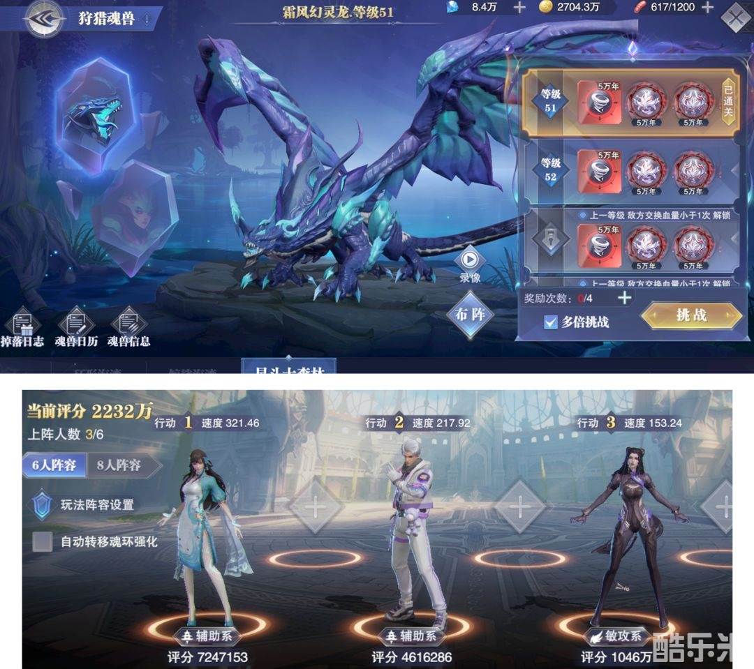 具体魂师参数及操作如下:这里宁荣荣攻击力171万,魂环配置12XX,有1星专属魂骨,战斗中使用1技能;奥斯卡攻击力120万,魂环配置21XX,有4星专属魂骨,战斗中使用1技能,然后猫攻击力310万,魂环配置XX2X,有1星专属魂骨,战斗中使用3技能普攻霜风幻灵龙。