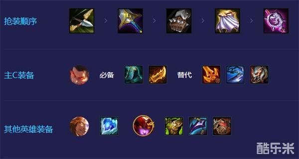 瑟提:主力输出,需求水银(必备)、杀人剑、羊刀或火炮;希瓦娜:主力前排,需求狂徒、反甲或者龙牙等其他防装;有冰心可以给凯隐打控制,有多余的输出装给霞。