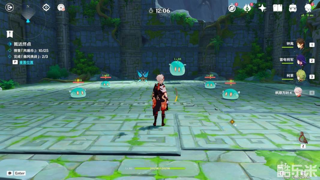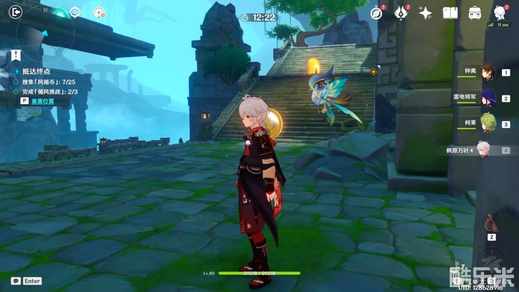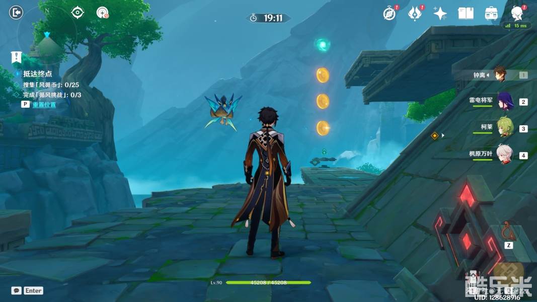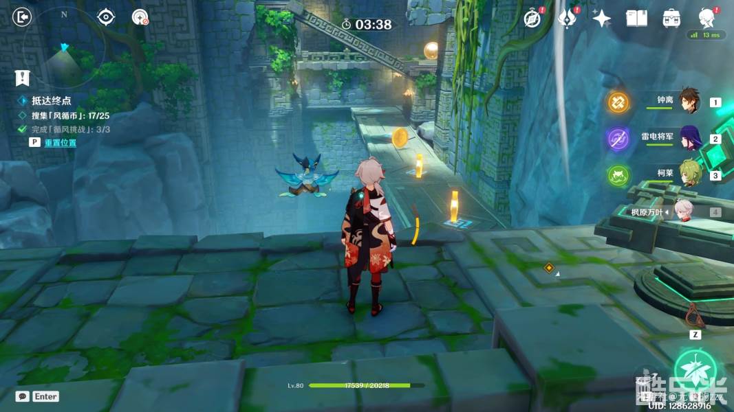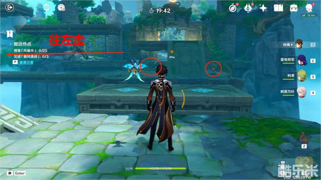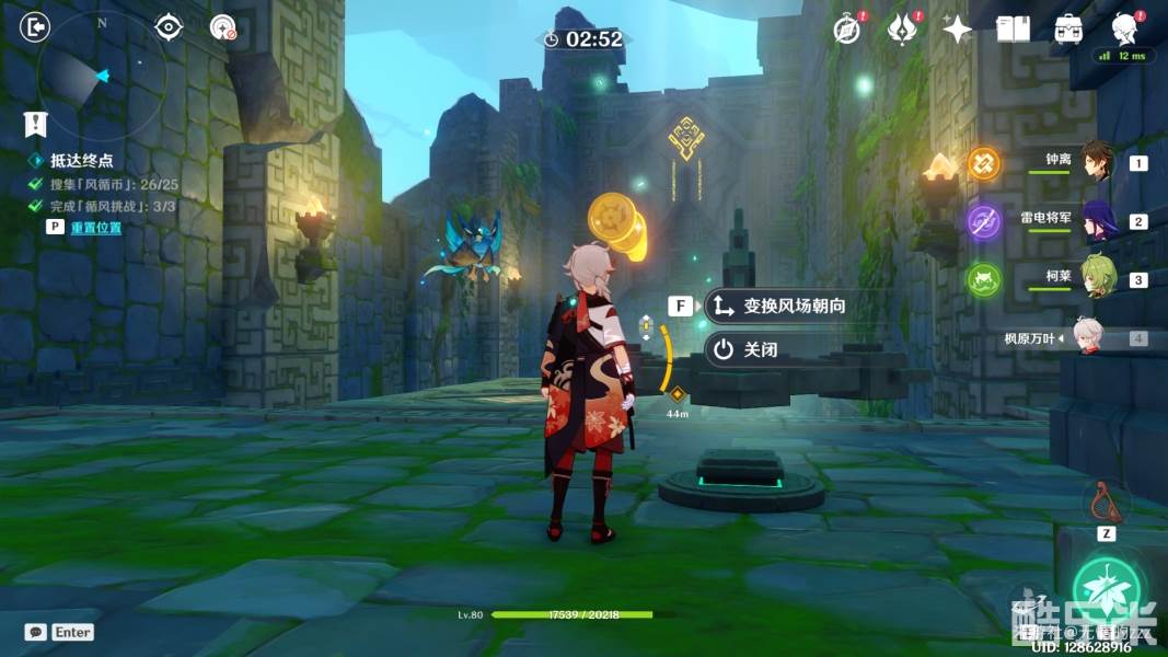 1.首先,我们进入秘境以后,先关闭图中右侧的机关,将风场关闭,随后将左边的拦风枢的风场方向调整为向上,随后往左走