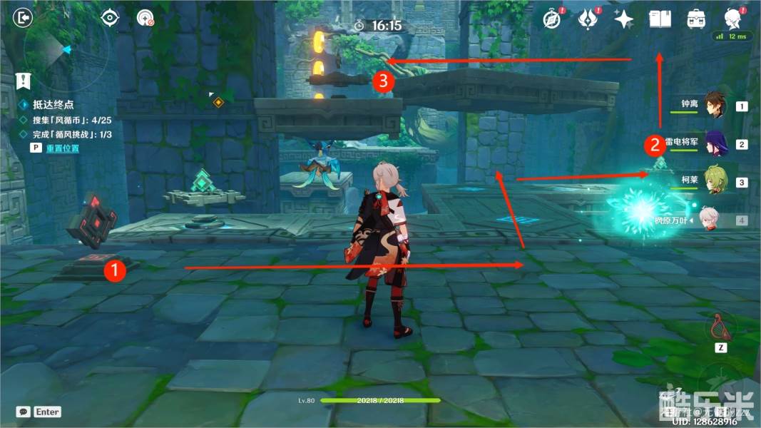 3.随后我们来到第二处地点,我们需要先将1号位置的机关关闭,随后前往2号机关处,将风场的方向设置为朝上的方向,随后将3号位置的机关风场朝向也设置为朝上的方向