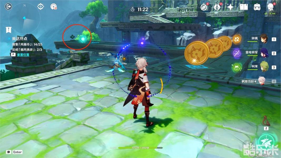 8.随后来到最后的点位,我们还是需要将风场方向朝上以后,鼓动风场。拾取金币即可