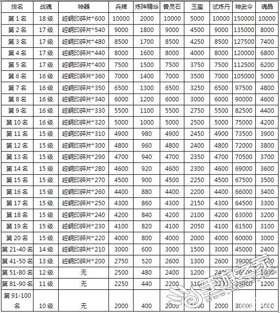 (6)活动期间,累计充值达到30w金币,无论排行名次,对应排名奖励中除战魂及神器碎片外,其余所有排名奖励均获得双倍。累计达到50w金币,所有排名奖励获得双倍。(双倍部分仅限表格中列出的排名奖励)