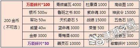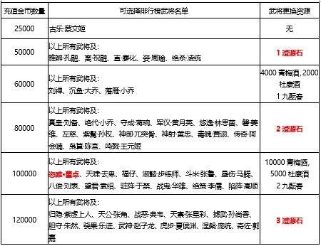 2、6个不同阶段中只能根据活动期间,累计充值金币数量所在阶段选择武将进行申请;如小明活动期间累计充值达到12W金币,则可以在列出的所有武将中选择一个武将,或者选择充值12w金币额度的澄源石(如武将和澄源石均不需要,则可以选择10w金币额度的进阶酒奖励);