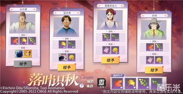 -活动期间,完成任务即可获得不同种类的落叶,不同的旅人会向船长讨要指定类型的落叶,赠予其落叶即可获得「强化卡·高级」、「神秘的冒险笔记」、大量「贝里」等奖励。