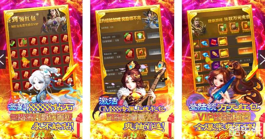 1、上线送满VIP,88888钻石,3亿元宝,专属称号,武将碎片*100,挖宝钥匙*50