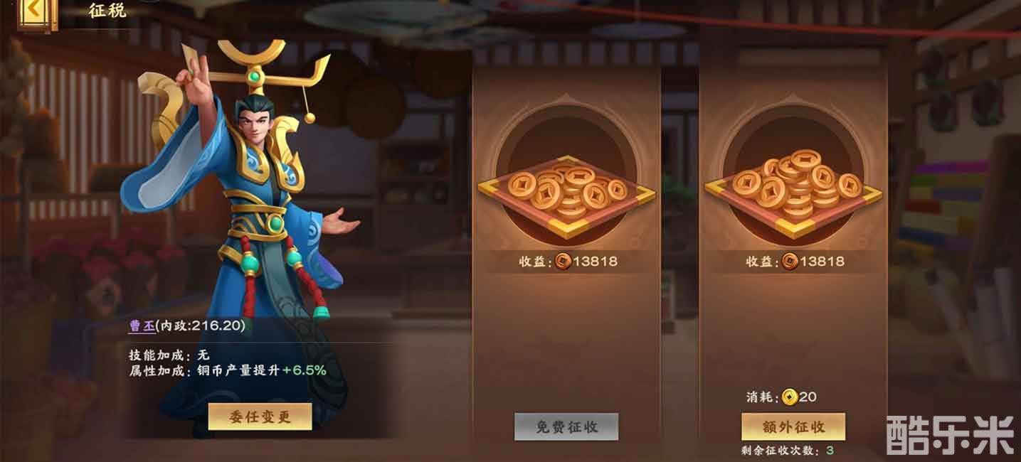 5.去征税也能获得铜币,我们可以选择免费还是花费金币征税,不过免费征税的机会每天只有1次。征税能获得的铜币数量与自然产出一样,受到民居等级和基础产量影响。但唯一不同的是,征税还会受到税务官的加成效果影响。