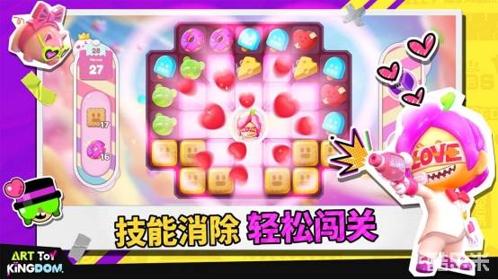 本作游戏中,所采用的是三消为主,结合箱庭摆放与模拟经营,目的是为玩家打造一个沉浸式代入感的潮玩世界。因此,相较于传统的消除游戏,我们还引入了全新的“潮玩”的世界观与角色概念,重新定义玩家与潮玩之间的关系,不再仅仅是消费者与消遣品的二元性,更多强调玩家与这些朝夕相处的伙伴们之间的好感度,亲密度。