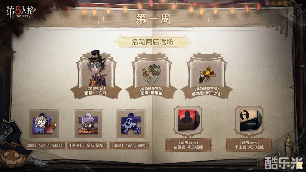 盛宴临近,多款道具也将于10月20日起返场活动商店或游戏商城,包括入殓师稀世时装-菲尼克斯及随身物品-子夜来使、邮差奇珍时装-“亡灵”、两款独特随身物品、三款主题涂鸦和追击音乐-欢乐惊魂等。活动商店还将上新三款应景的新菜品,为你心仪的角色送上完美大餐!