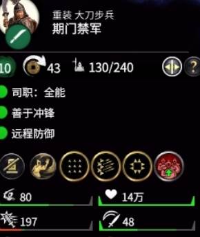 ③矛墙:3秒列阵,+1900%冲锋抗性;+10%近战躲闪;-100%远程格挡。反制冲锋;无法奔跑;