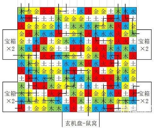 2、五行机关:按照金木水火土的顺序不断的循环下去,不用怕老鼠偷东西,等走到最下面的最左边有个老鼠洞,会有被偷的所有东西,过机关的时候慢慢来,别急,别看花眼,附上图解一份。