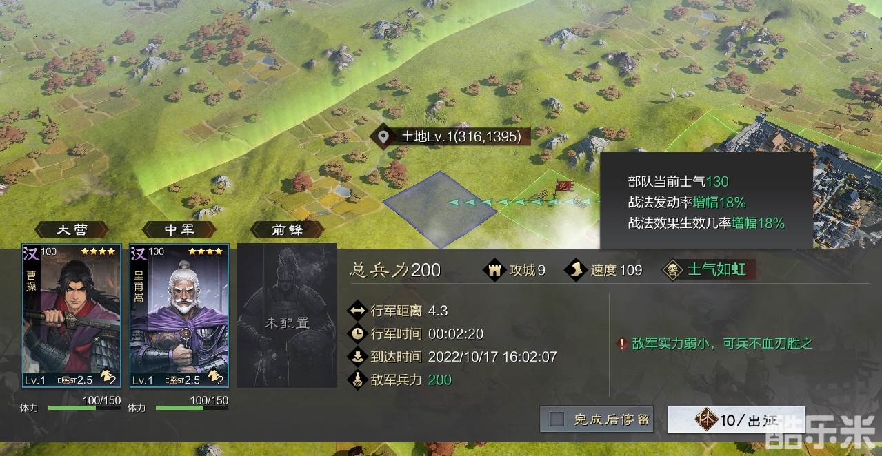更新士气玩法后,土地守军部队也将具有士气属性,其士气不随主公部队的行军距离而变化。为保证体验,我们将取消土地守军兵力随主公部队行军距离提升而增加的设定,同时对各等级土地守军兵力进行小幅提升。