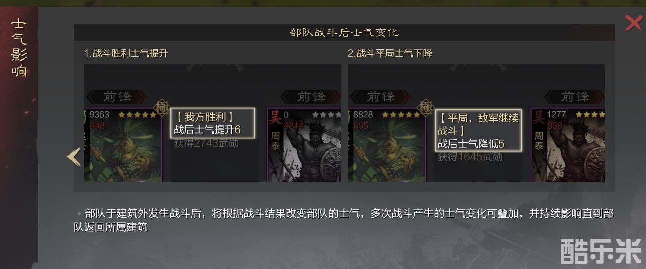 除先前蓝贴中提到的行军距离、补给范围等战略因素可对士气造成影响以外,处于建筑外的部队也将根据战斗结果改变部队士气:若战胜强敌,则部队士气会提升;而若陷入苦战,则部队士气也会下降,士气改变将持续影响直到部队返回所属建筑。部队士气的高低最终将在战斗中影响武将战法发动率与生效几率。