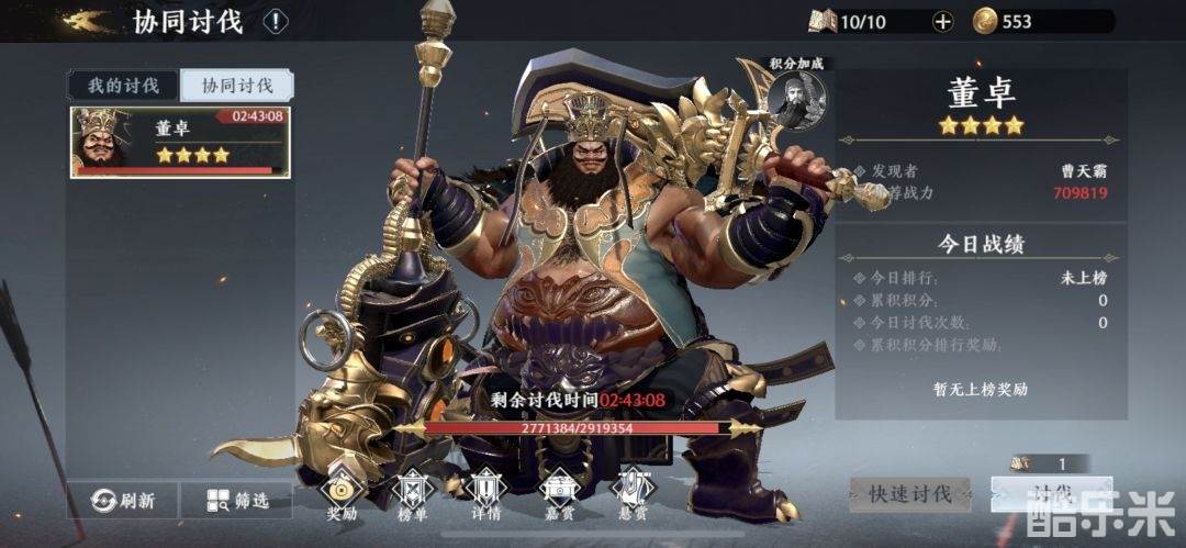 5、挑战讨伐目标需要消耗讨伐檄文,其将在每日0500回复10点,达到上限后不再回复。(这个可以通过玉龙购买,40玉龙一个讨伐檄文)