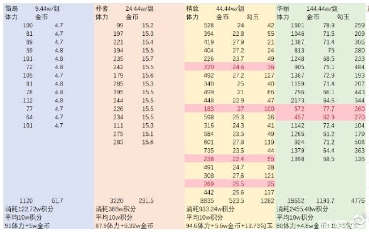 以我的账号爆率来看,华丽相对最划算,虽然金币体力相对最少,但蓝票和勾玉资源是最多的,而且有概率出黑碎。
