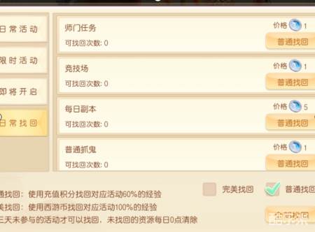 注意:找回分为普通找回和完美找回,普通找回是需要消耗银币,完美找回需要消耗西游币,但是完美找回的经验会更多。
