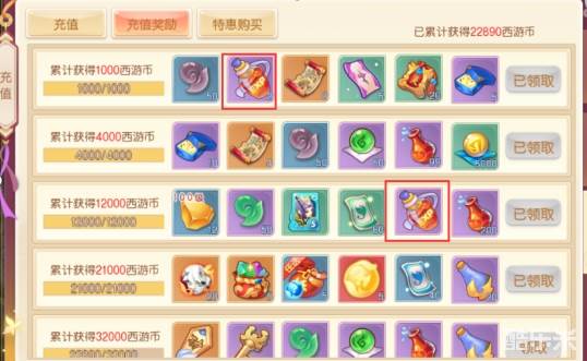 还可以通过各种充值福利或者活动获取该道具,例如点击特惠,充值奖励界面。累充1000西游币也可以获得该道具。