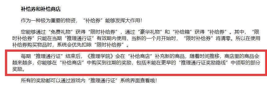 小编也前去官网查了一下,官方的解答是:你能够在“补给商店”中购买到往期的奖励,包括未能在更早的“推理通行证奖励路线”中领取的部分奖励。