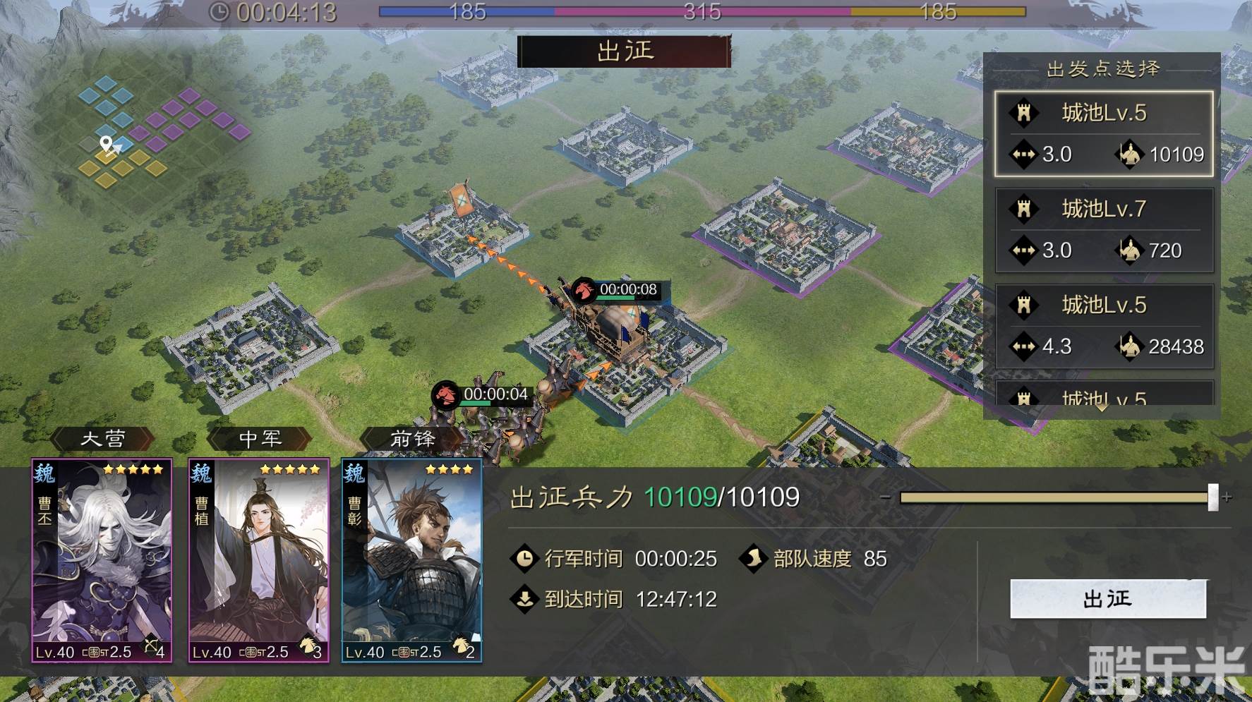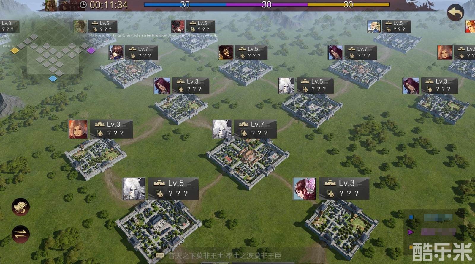 点兵连城中,三名主公将在分布着许多由官道相连的城池的山谷中进行攻伐。在限定的游戏时间内,主公们需要分配兵力,出兵占城。