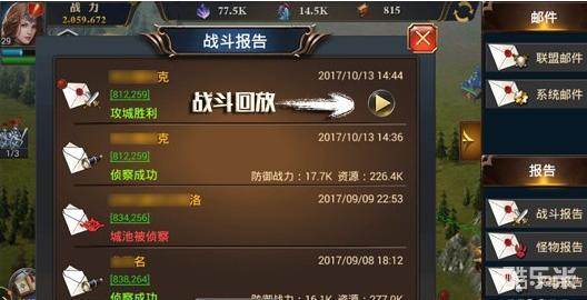反馈是决策的重要依据,有句话说“玩SLG多看战报就能装大神”,其实也是说明了,在普遍没有战斗表现的SLG中,玩家依赖战斗结果数值进行判断,并在不断的尝试和失败中学习。打开《英雄文明》战报系统,可以查阅战斗报告、怪物报告、采集报告。战斗报告包括了所有玩家与玩家之间的互相侦查、攻城、对战、援助等情况。