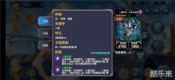 入魔邪龙3个技能一回合只能选择其中一个发动一次,强在应对全面,可以吹对方墓地,可以吹场上怪兽,还能随机削1卡。能够为你节约卡位达成多个需求,对于武神和abc而言魔龙非常好召,虽然出场频率不高。