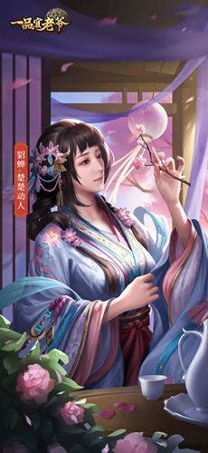 貂蝉身着紫色衣袍,头戴紫色花簪,风髻露鬓,淡扫峨眉眼含春,皮肤细如温玉柔光若腻,樱桃小嘴不点而赤,娇艳若滴。手拿梅花,风吹散开点缀的恰到好处。
