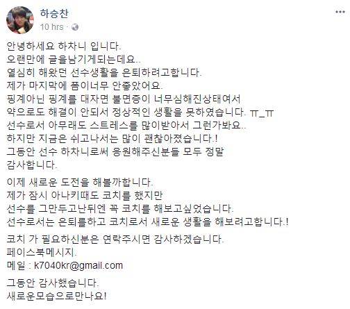 大家好,我是Hachani,好久没有更新我的消息了。我准备退役了,最后一段时间表现实在是太差了。如果硬要找借口,我的失眠症太严重了,药物都无法缓解,没有办法过正常的生活。可能是因为职业选手压力太大了吧,现在休息了一段时间就好多了!感谢大家一直以来支持作为选手的Hachani,现在我准备开始新的挑战了。