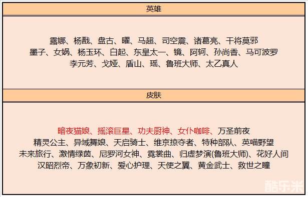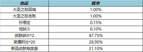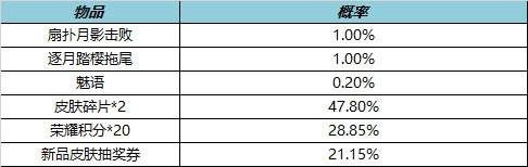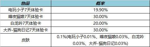 打开后必得皮肤碎片*2、铭文碎片*100和以下随机奖励之一:皮肤或皮肤体验卡(7日)1张(鲁班七号-电玩小子、阿轲-暗夜猫娘、韩信-白龙吟、大乔-猫狗日记)