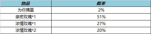 购买红蓝对决(1日),可额外随机获得以下之一:为你摘星*1、亲密玫瑰*1、浓情玫瑰*1、浓情玫瑰*2。累计20次至少可获得为你摘星*1。